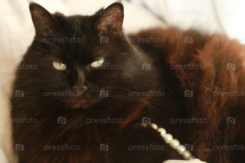 Черная пушистая кошка на диване. Домашний любимый питомец