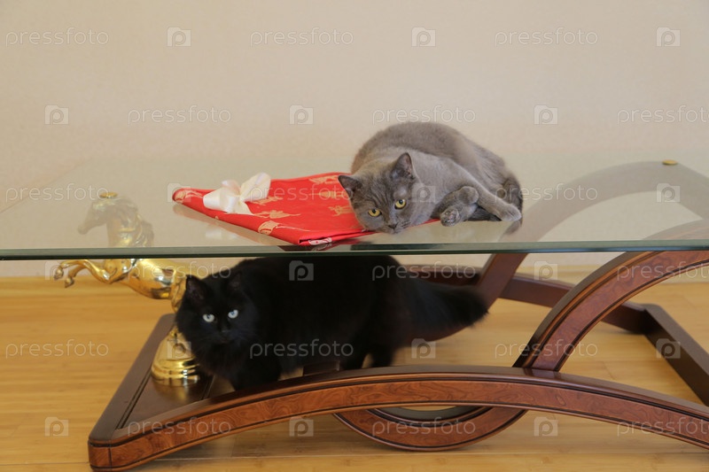 Две кошки черная и серая , игры домашних питомцев, журнальный столик. Любимые домашние животные
