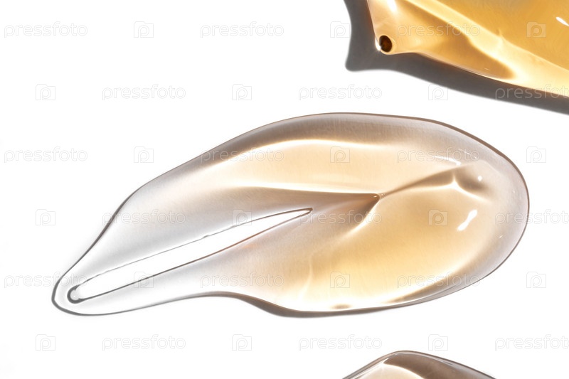 Текстура глицеринового геля. Прозрачная капля сыворотки на белом фоне. Жидкий гель-увлажняющий крем с пузырьками макроса