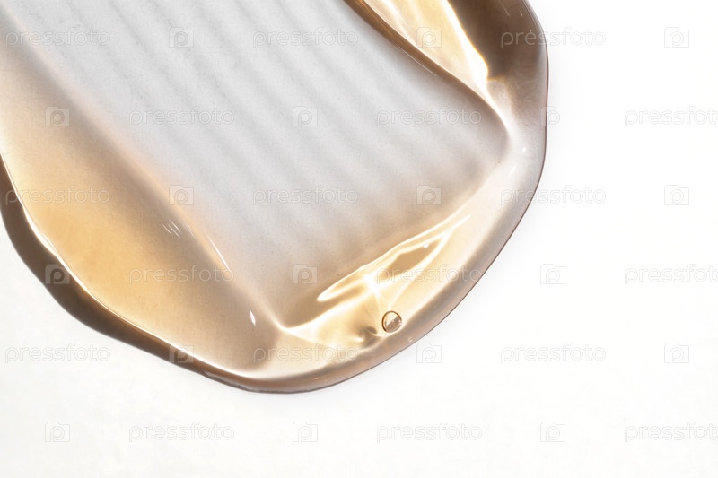 Текстура глицеринового геля. Прозрачный мазок сыворотки крупным планом на белом фоне. Жидкий гель-увлажняющий крем с пузырьками макроса