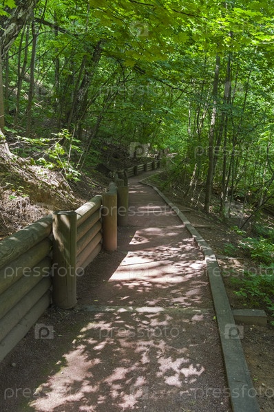 Благоустроенная пешеходная дорожка в природном заказнике на Воробьевых горах. Москва, солнечный день в июле