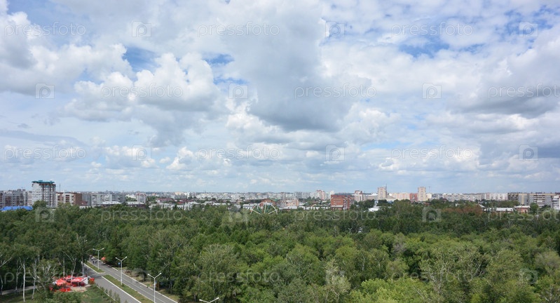 Вид с колеса обозрения на парк и город Омск
