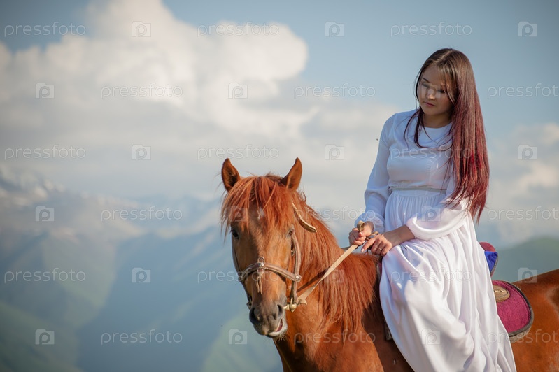 Киргизская девушка азиатской национальности едет на лошади в белом платье