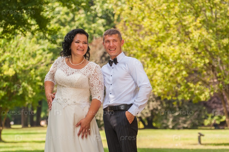 Улыбающиеся и счастливые жених и невеста во время свадебной прогулки на природе