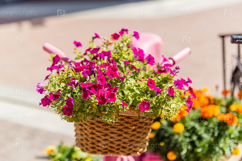 Европа, уличное украшение цветы в горшке на руле велосипеда крупным планом, солнечный день