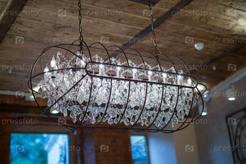Большая железная лампа под потолком со стеклянными подвесками в интерьере кафе