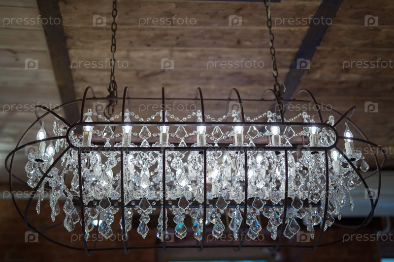 Большая железная лампа под потолком со стеклянными подвесками в интерьере кафе