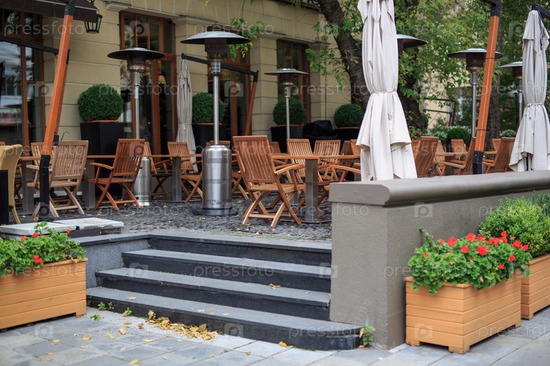 Уличное кафе с деревянной мебелью без людей