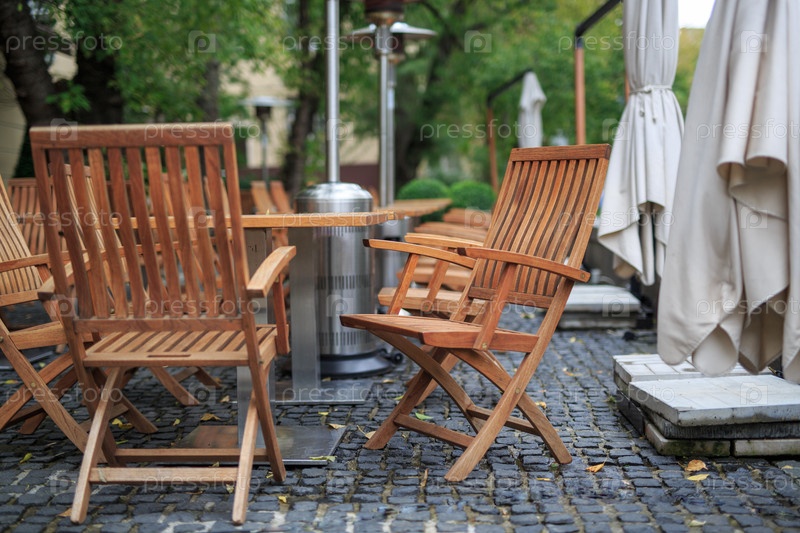 Уличное кафе с деревянной мебелью без людей