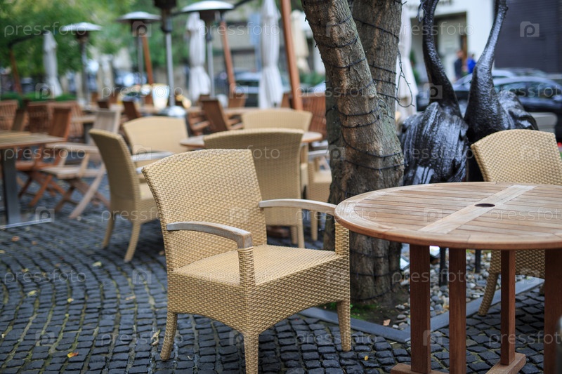 Уличное кафе с деревянной мебелью без людей