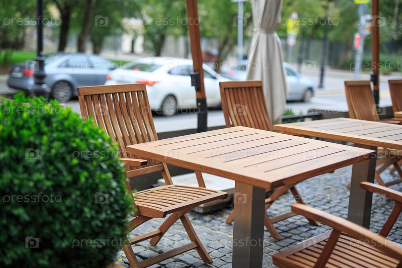 Уличное кафе с деревянной мебелью без людей