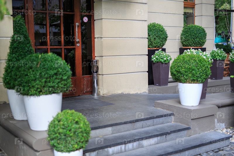 Ступеньки вход в уличное кафе с большими кадками растений без людей