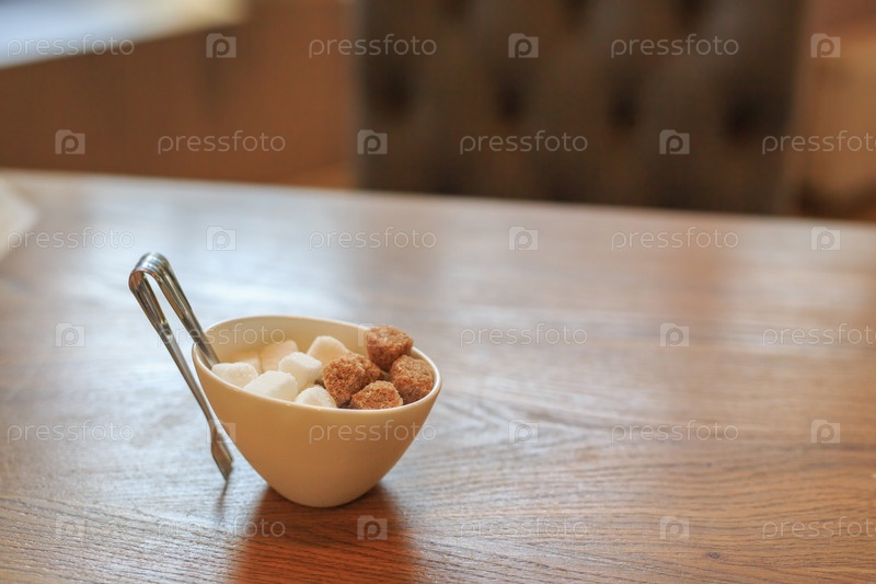 Белая сахарница с тростниковым сахаром стоит на деревянном столе