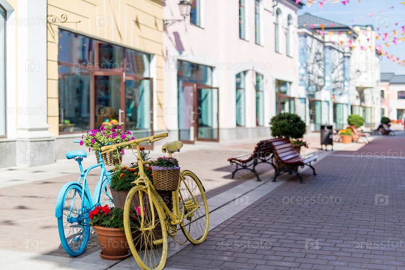 Европейские уличные магазины, клумбы цветов, украшение велосипедами, Солнечный день, крупный ракурс, улица без людей,