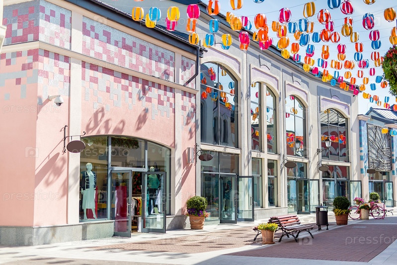 Европа, уличные бумажные фонарики, голубое небо, летнее солнце, улица магазинов, крыши магазинов, большие стеклянные витрины