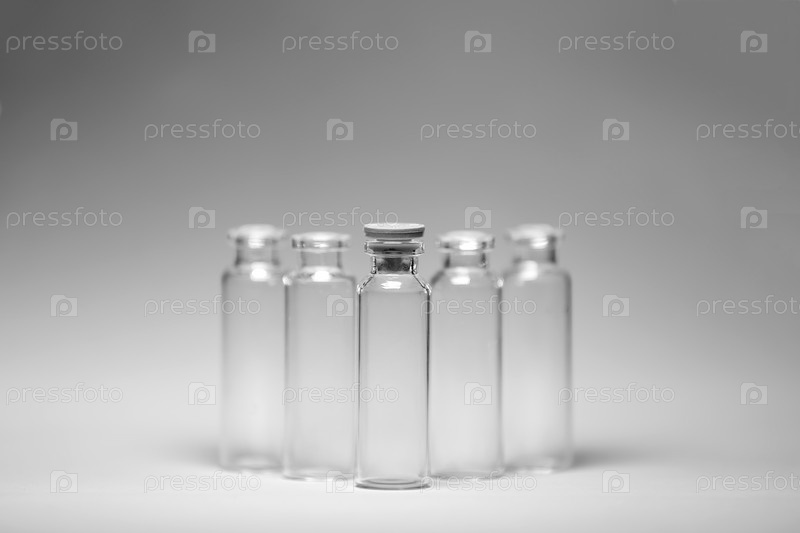 Стеклянные медицинские баночки стоят в ряд на сером фоне