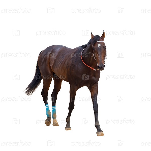 Гнедой конь идет изолированный на белый фон