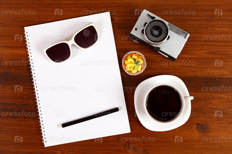 Ретро-пленочный фотоаппарат, солнцезащитные очки, кекс, чашка кофе и блокнот с карандашом на коричневом столе. Вид сверху