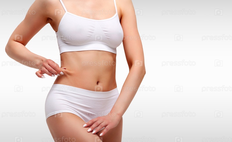 Женщина ущипывает жир на животе, крупный план на сером фоне с копирайтом