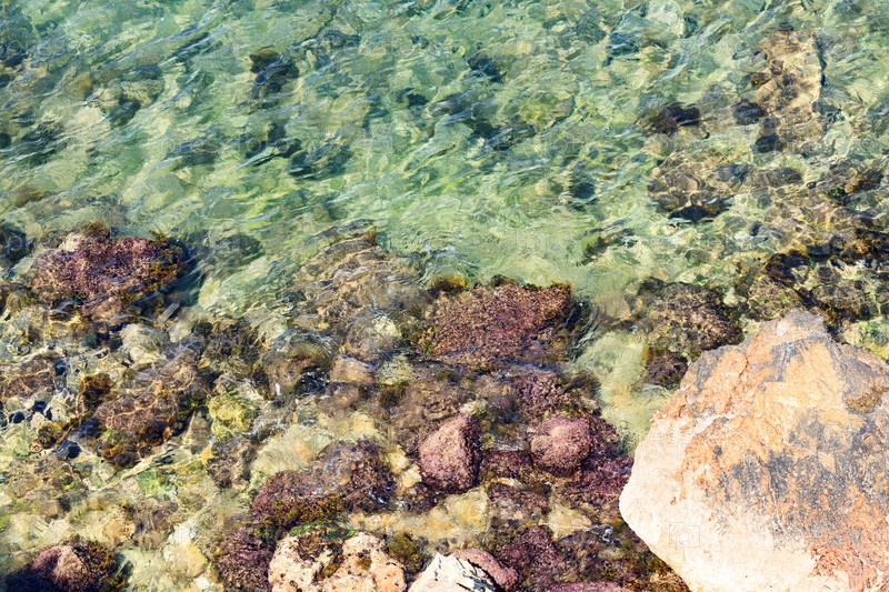Красочные камни с зеленым мхом на фоне мелководья