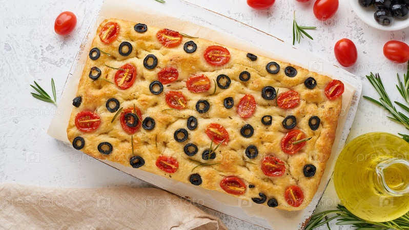 Фокачча с томатами, оливками и розмарином, вид сверху. Итальянская лепешка, бутылка с маслом