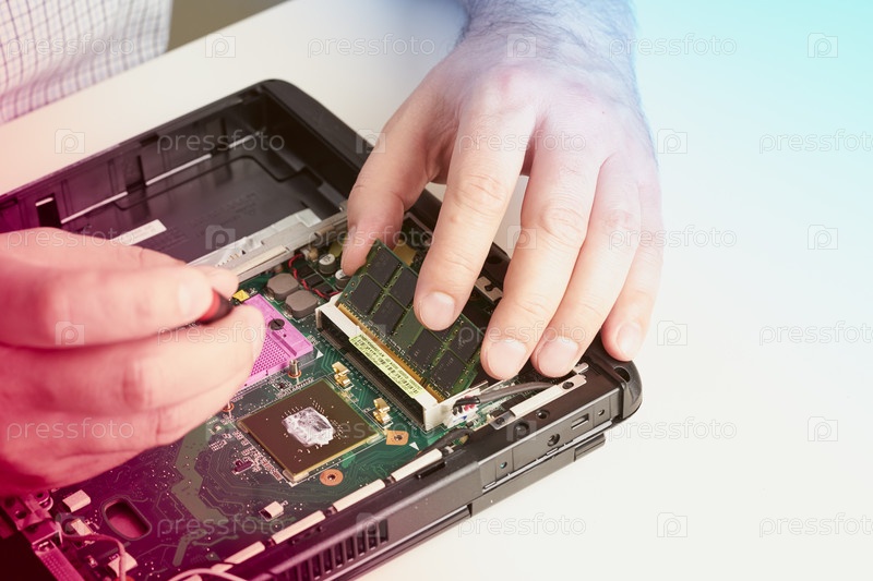 Мужчина ремонтирует компьютер. Инженер по ремонту в рубашке ремонтирует ноутбук, за белым столом у белой стены