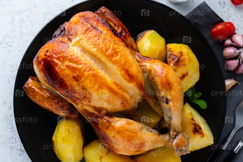 Целая курица на гриле в черной тарелке на белом столе, запеченное мясо с картофелем. Вид сверху, крупный план