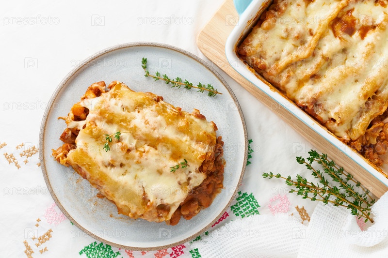 Паста каннеллони с начинкой из говяжьего фарша, томатов, запеченная с соусом бешамель