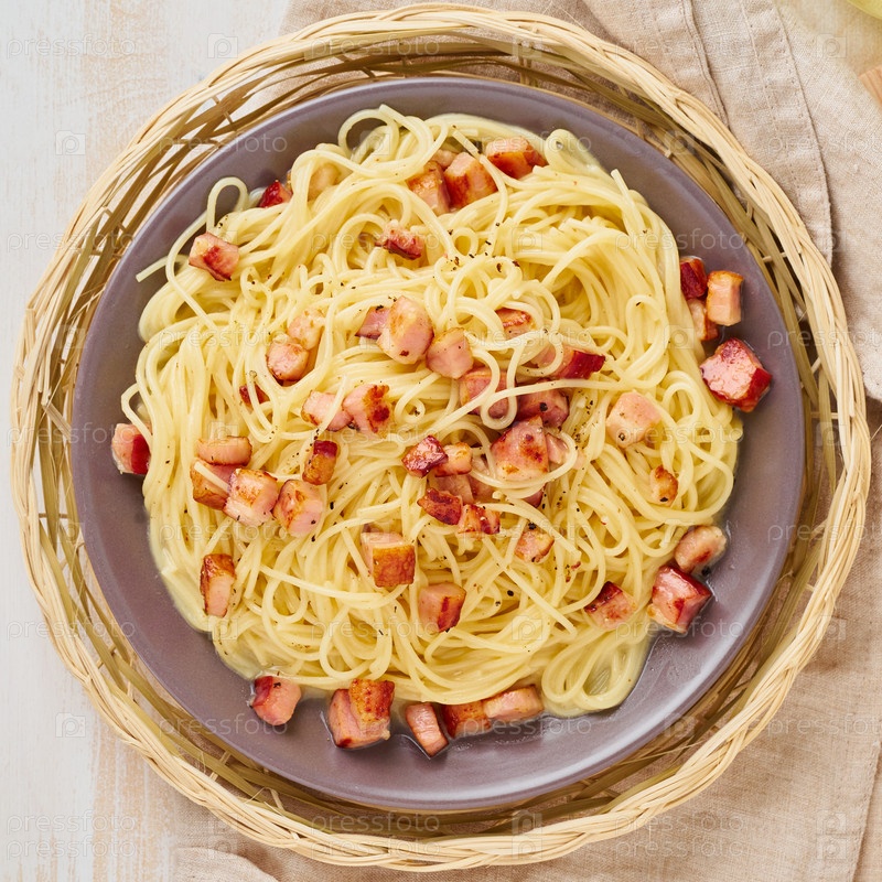 Крупным планом паста карбонара. Спагетти с беконом, яйцом, сыром пармезан и сливочным соусом. Вид сверху. Традиционная итальянская кухня