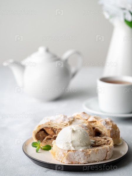 Яблочный штрудель с мороженым и корицей. Выпеченный пирог и чай, вкусный десерт на столе. Вид сбоку, вертикальный