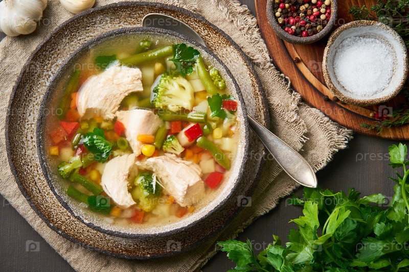 Домашний куриный суп с овощами, брокколи на темно-коричневом фоне, вид сверху