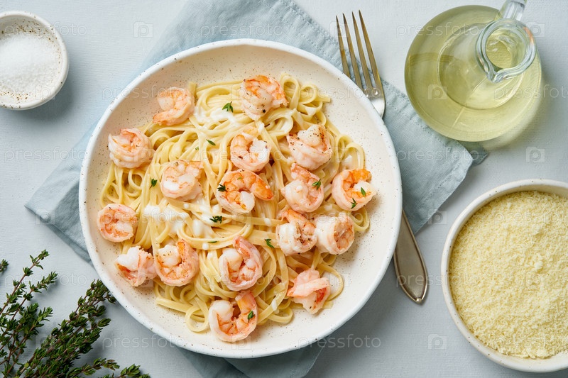 Паста баветте с жареными креветками, соусом бешамель, тимьяном на синем столе, вид сверху, итальянская кухня
