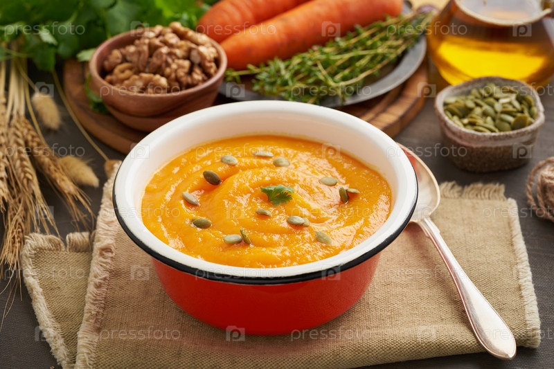 Крем-суп из тыквы с семенами и грецкими орехами, морковью, вид сбоку с осенними листьями для создания атмосферы