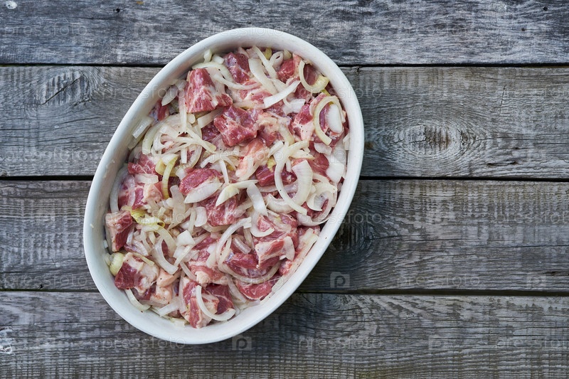 Подготовка к барбекю, маринованное мясо на темном деревянном фоне вид сверху копия пространства