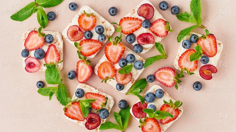 Хрустящие хлебцы с ягодами и фруктами, красочная концепция на терракотовом фоне, вид сверху крупным планом