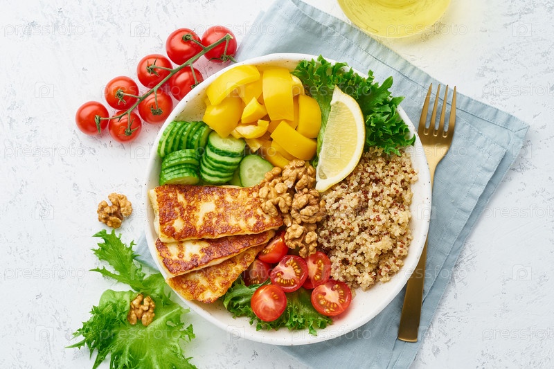 Чаша Будды с халуми, киноа, салатом-латуком, сбалансированное питание, белый фон, вид сверху