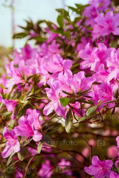 Цветы цветут азалии, розовые бутоны рододендрона на зеленом фоне