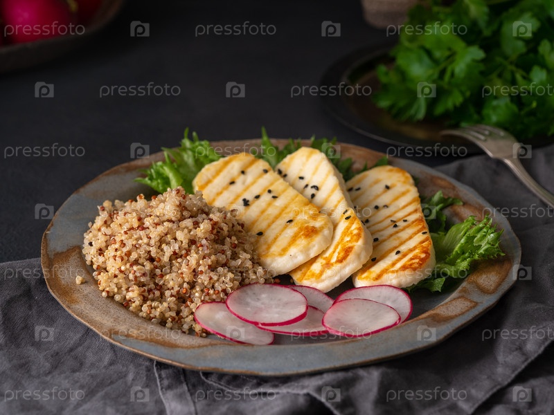 Халлуми, жареный сыр с киноа, салат, редис. Сбалансированная диета на темном фоне, вид сбоку