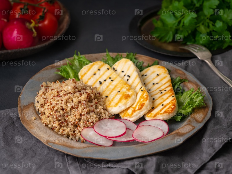 Халлуми, жареный сыр с киноа, салат, редис. Сбалансированная диета на темном фоне, вид сбоку