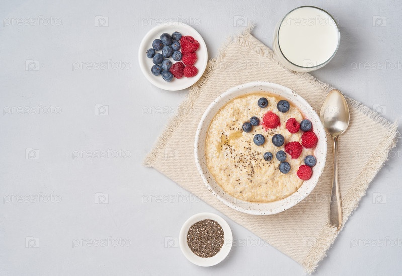 Овсянка с ягодами, чиа, кленовым сиропом и стаканом молока на сером светлом фоне. Вид сверху, копия пространства. Здоровый диетический завтрак
