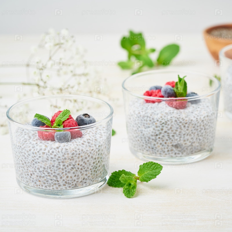 Чиа-пудинг со свежими ягодами малиной, черникой. Два стакана