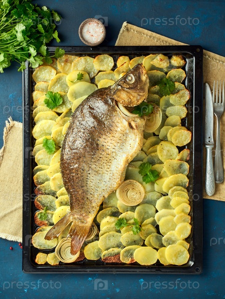 Запеченный карп, целая рыба из духовки с нарезанным картофелем на большом подносе. Традиционное польское блюдо