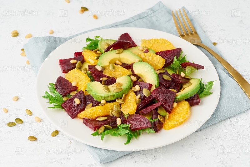 Веганский салат со свекольным творогом, авокадо, апельсином, фетой, рикоттой и тыквенными семечками, диета кето-деш,