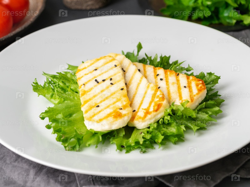 Жареный халлуми, жареный сыр с салатом-латуком. Сбалансированная диета, белая тарелка на темном фоне, вид сбоку