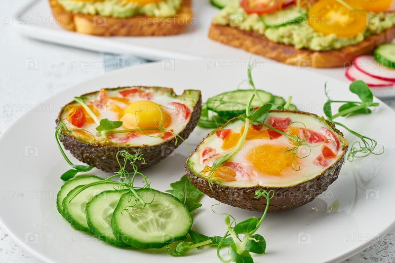 Яйцо, запеченное в авокадо, тост, завтрак, крупным планом