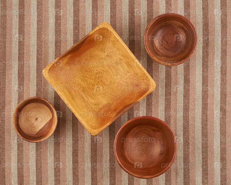 Деревянная миска на коричневой льняной салфетке, круглая и квадратная форма