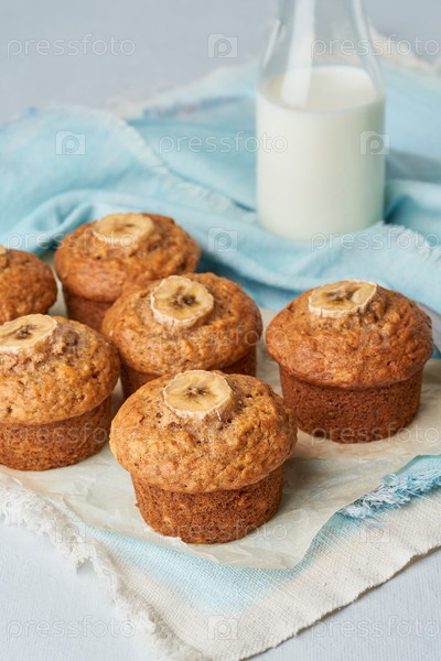 Банановый кекс, вид сбоку, вертикальный. Кексы на синей салфетке с молоком