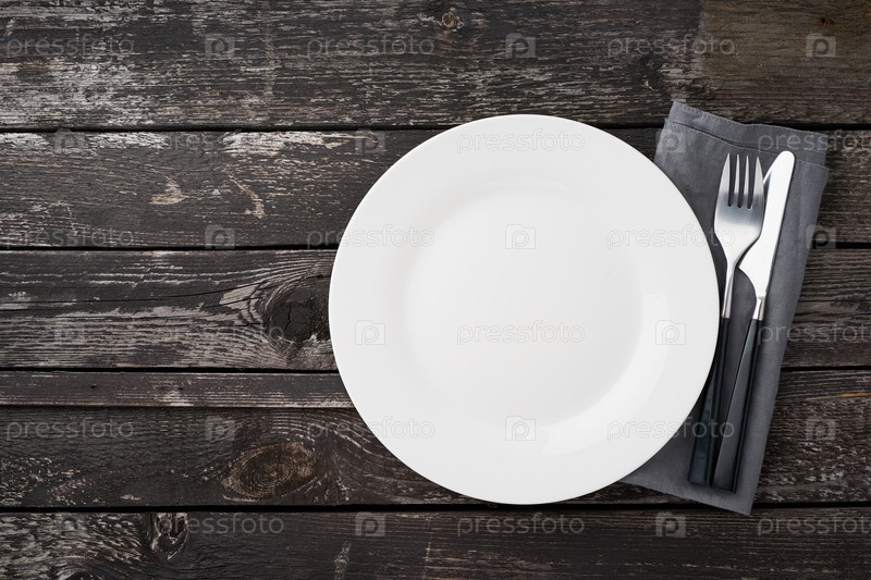 Чистая пустая белая тарелка, вилка и нож на сером старом деревенском деревянном столе, место для копирования, макет