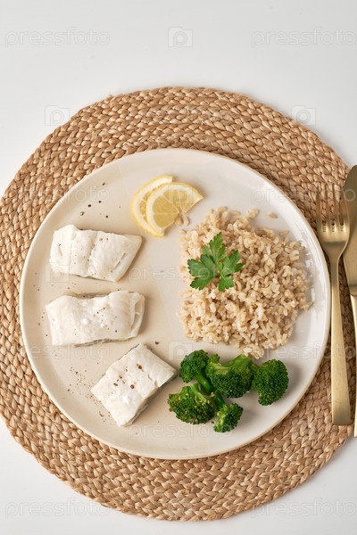 Треска на пару с коричневым рисом и овощами, диета Dash Fodmap, вид сверху