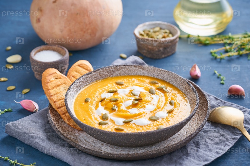 Суп-пюре из тыквы на темно-синем деревянном столе, семена, тосты, диетический вегетарианский обед, вид сбоку